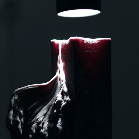 Wyan: Yes, metal wire sculptures were hidden inside of the candles. This combination of soft and hard material symbolises the casting of concrete around a rebar frame in modern buildings. The candles are like miniature skyscrapers in Hong Kong, built by reinforced concrete. The reinforced concrete technique became common at the end of the 19th century in Europe, and it was introduced to Hong Kong in the early 20th century. The first reinforced concrete building was built by the government in 1915. Although the technology is so common that it is difficult to imagine a construction world before it, it only existed for a little more than a century. It became popular in such a short period of time because the cost is lower compared to previous construction with steel frames, iron, stone and bricks. The degradation of reinforced concrete is presented through these soy wax candles with wires inside.