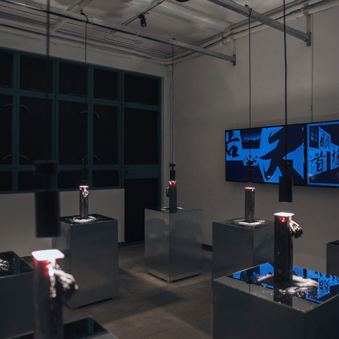 Twenty-one Twenty-one occupies two exhibition spaces. Stepping into the room on the left-hand side, the spectator becomes an audience from the year 2121––hence the title of the work––looking back to Hong Kong’s historic nano-building in 2022. All items in this historic architecture are made of iron, which had deteriorated over time. The room on the right-hand side leads to a totally different living space in 2121. The emergence of the metaverse in 2022 has encouraged human beings to pursue inwards to the body and soul. By that time there is no longer clear distinction between the real and the unreal world.