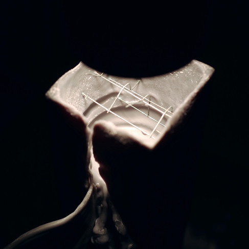 Although we tried to design the shape of the wire frame, the ways in which the wax are melted are very different. Now we can see in the exhibition that the melted wax spreads into the shape of angel wings, which is definitely not what was predicted on day one.