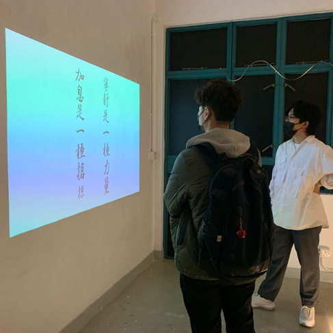 Wyan: Yes. Composed by myself, the limericks are actually fun, silly, and somewhat morbid jokes about the absurdity of property prices that turned people in Hong Kong into mortgage slaves. The calligraphy was written by hand and was then digitised and put on a screen in the galvanised iron room. The screen shows only white noise when there is no-one around. When spectators come close to the screen, the sensors that are attached to the bed legs will be triggered, and the video of the limericks’ calligraphy will be shown on screen. Characters appear on screen one-by-one at a reading speed. When no-one is around, the words fade out and the screen returns to video noise.